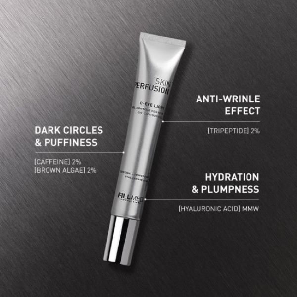 FillMed C-Eye Light Serum is an eye gel for dark circles, early fine lines, puffiness, signs of fatigue. A new innovative gel inspired by Cryotherapy, that restores vitality and brings instant relief to the eye contour. The unique iced Cryo-zamac applicator offers technical and ultra-precise application, to reactivate microcirculation, drain and decongest puffy eyes, and maximizing efficacy. It combines the perfect blend of powerful active ingredients at the right dose, for an optimal skin absorption and a targeted action, of Caffeine, Hyaluronic Acid and Tripeptides. The eye contour is instantly brighter, fresher and revived. All skin types. Ideal for sensitive eyes.