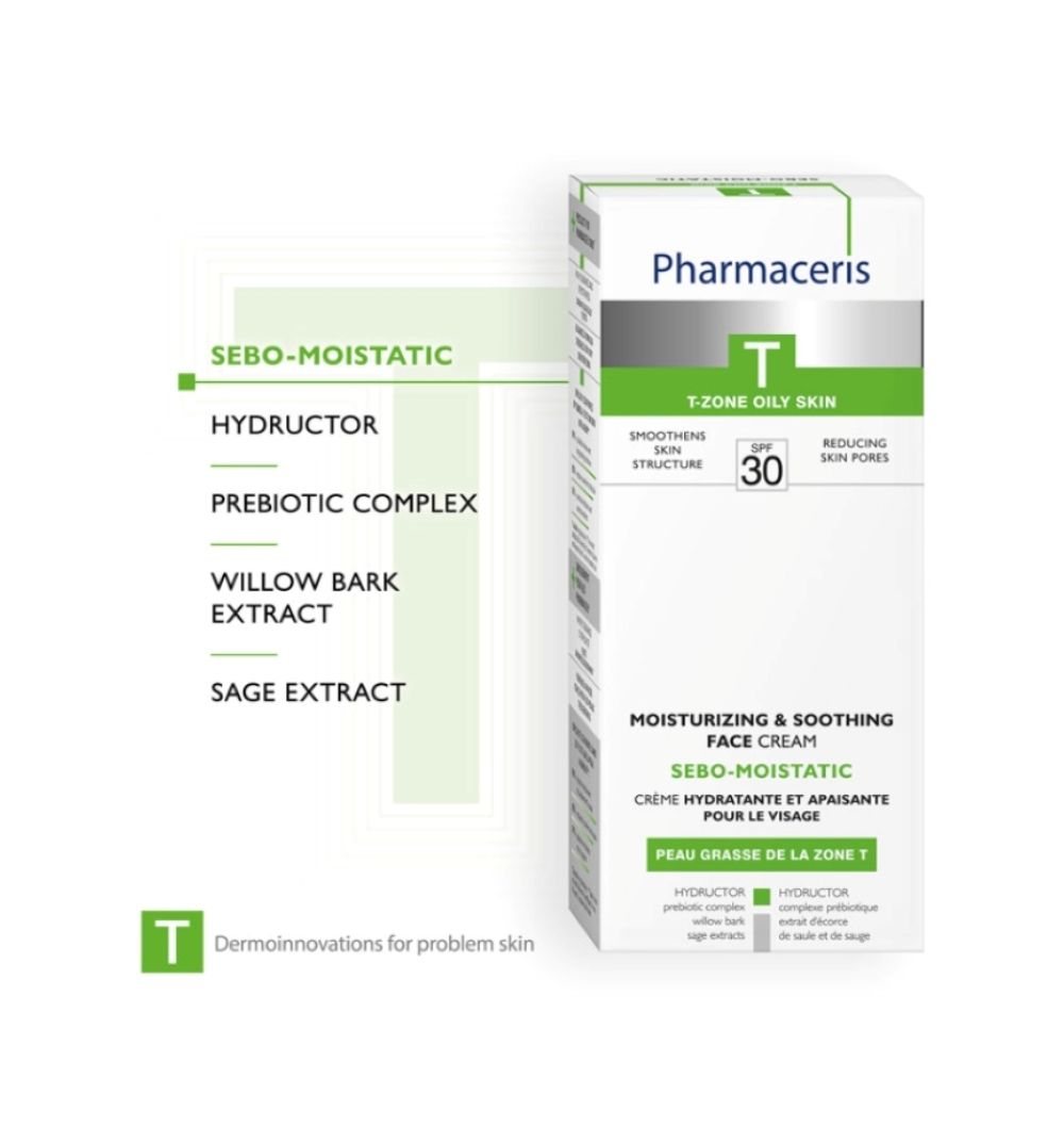 Pharmaceris T Moisturizing & Soothing Face Cream SPF 30 is designed for acne-prone skin that is dry and irritated from anti-acne treatments, needing UV protection. It deeply hydrates dry skin, maintaining moisture balance with hygroscopic molecules and Hydructor, reducing discomfort and tightness.