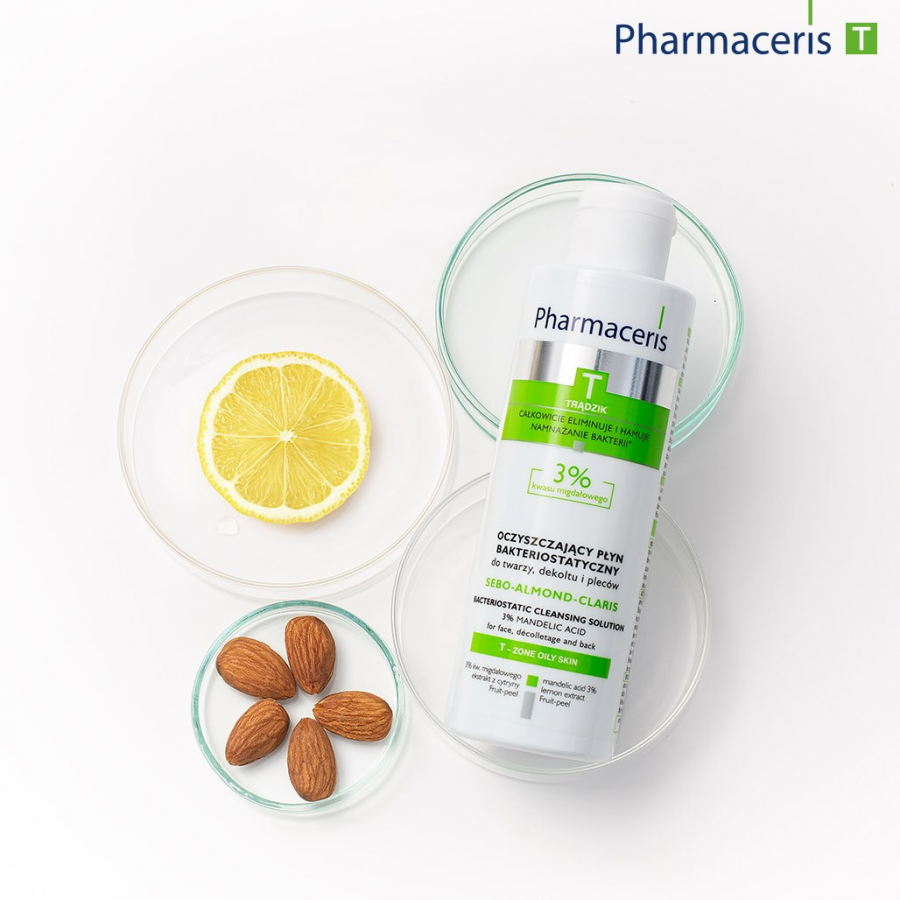 Pharmaceris T Sebo-Almond-Claris Bacteriostatic Cleanser is designed for acne-prone skin with inflammatory lesions, scars, and discolourations.